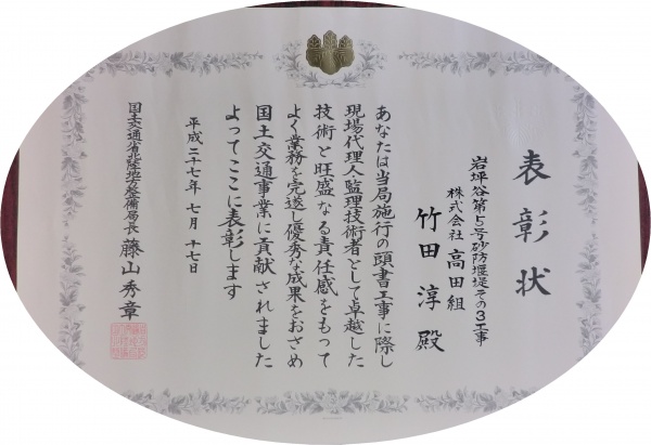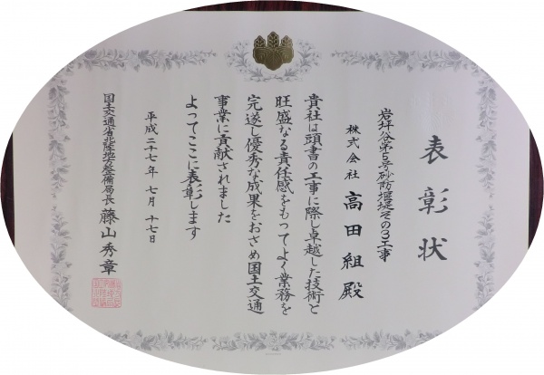 平成27年7月15日、北陸地方整備局において『国土交通事業関係功労者等表彰式』が執り行われました。良質な社会資本整備、建設技術の向上及び円滑に事業を推進するために、北陸地方整備局の発注した工事及び委託業務等について、その施工又は成果が優秀で他の模範となる者を表彰しています。