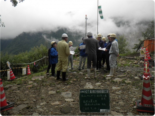 平成27年9月14日、金沢工業大学 宮里教授と、環境・建築学部 環境土木工学科の皆さんを、堂口専務(平成11年金工大卒)が立山カルデラにご案内致しました。