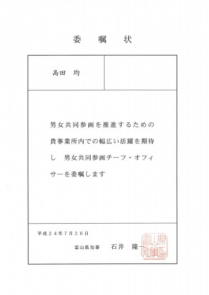 北陸地方整備局長より、平成28年度 工事成績優秀企業として認定を受けました。