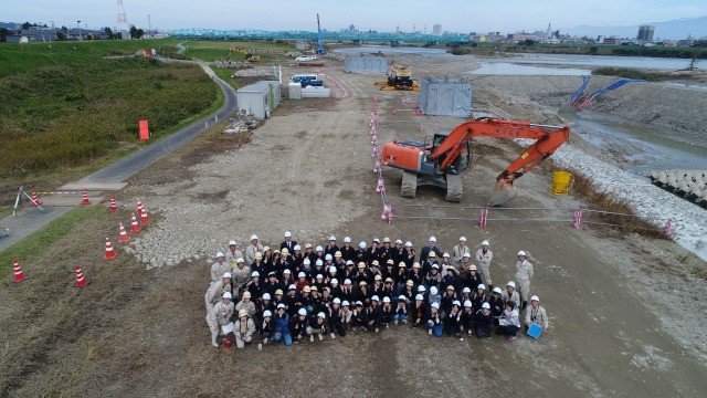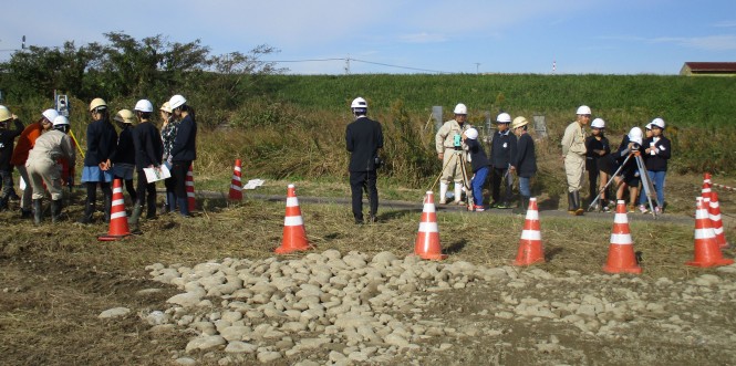 この現場見学会では、生徒さんたちに、「この工事現場でなぜこの工事が必要なのか?」を理解してもらい、「建設業って大切だな~」、「建設業っておもしろそうだな~」と、建設業への関心をもってもらうために企画しました。