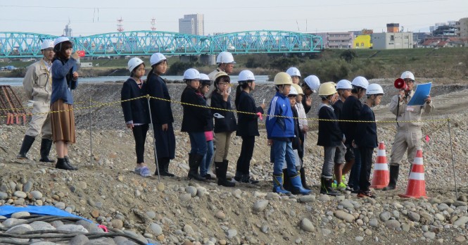 「神通川の堤防の護岸を新たにつくるために、直径40cmの石を積み、その間隙にコンクリートを詰め、堤防をより頑丈にしている」と説明しました。