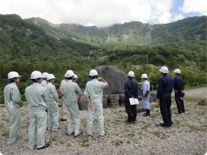 当日は、朝方まで多少雨が残り天候が危ぶまれましたが、いざカルデラ内に入ると雲が晴れ、「鳶崩れ」もはっきりと見えるほどでした。案内役は前回に続き、午前の部が自身も卒業生である専務の堂口(平成11年卒)と現場代理人の橋場、そして若手技術者の野口です。午後の部は多忙中であるにもかかわらず依頼を快諾いただいた水谷出張所の青木所長様です。