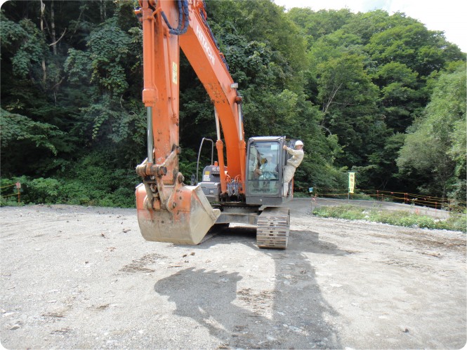 9時に亀谷料金所を出発した一行は、10時ごろに当社が施工する「H30 真川第3号砂防堰堤工事」現場に到着すると、工事説明を受けてさっそく現場へ、施工状況を見学するとともに、自動追尾型の光波測距儀を用いた測量体験や大型重機の操縦体験など、学校ではなかなか手に取ることのできない体験をしていただきました。