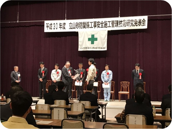 平成31年2月21日に行われた”平成30年度 立山砂防関係工事安全施工管理研究発表会”において、橋場洋平さんの「斜面崩壊箇所と土石流発生について」の論文発表が、奨励賞を受賞しました。