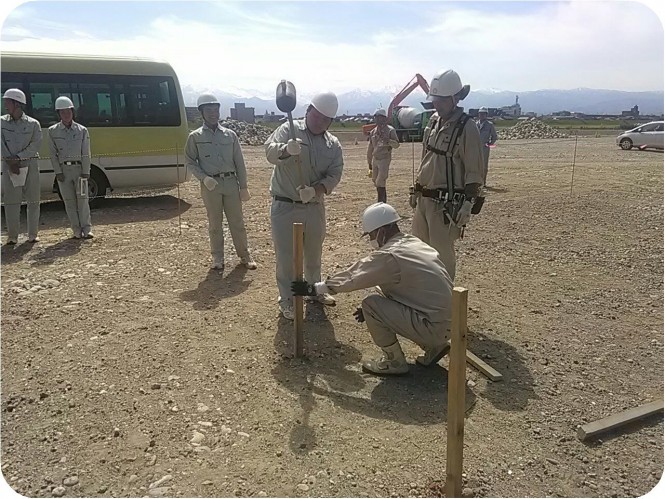 木杭打込みでは、木杭を固定するのに専用の道具を使って固定し、打ち込み、測量する体験をしてもらいました。