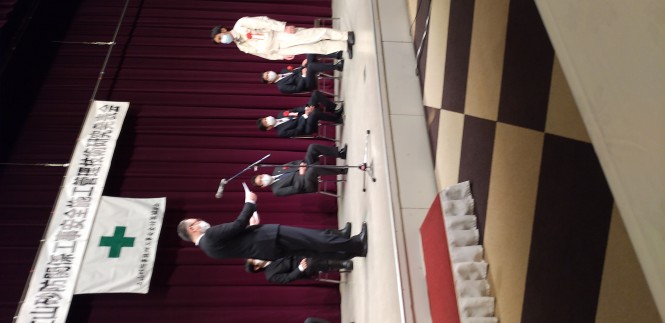 砂防堰堤を新設する工事において、進捗に伴い高所作業が多くなることから、墜落災害防止の取組みについて発表しました。