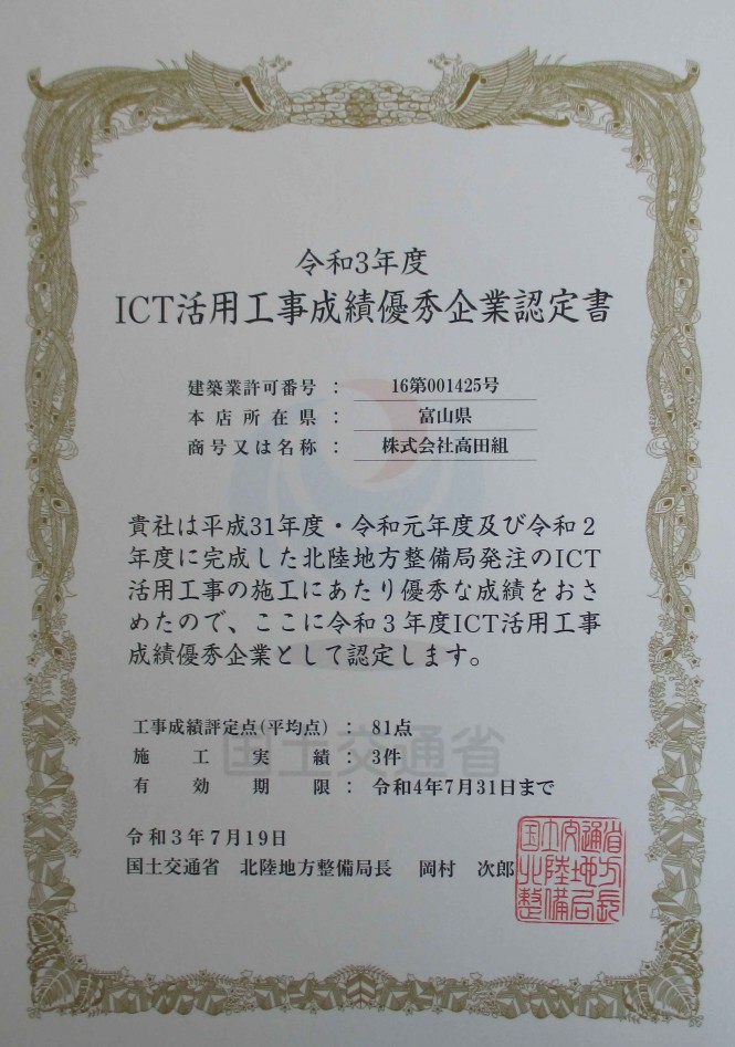令和 3年7月19日、北陸地方整備局長様より「令和3年度 工事成績優秀企業認定書」を頂きました。