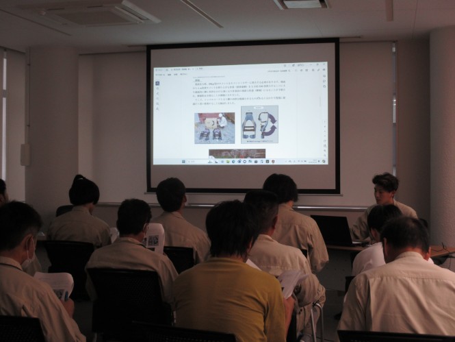 工務部の菓子さんより、「外ヶ谷第10号砂防堰堤改築工事における安全対策について」工事経験の発表がありました。