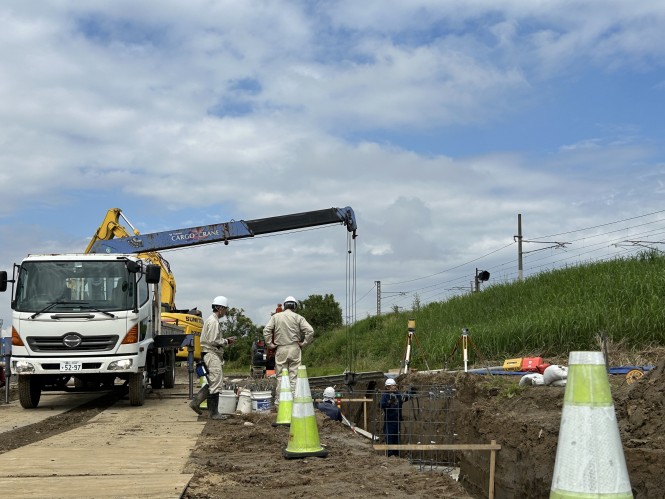 この現場では、農業用用水路をつくる工事をしています。