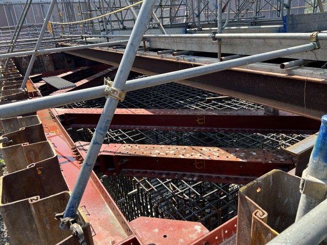 富山市の金屋町にある現場で、JR高山線を跨ぐ跨線橋の新設工事を行っています。