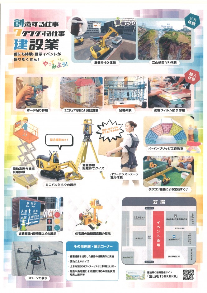 9月28日、富山駅イベントスペースにて富山県主催の「けんせつ×テックフェス2024」が開催されました。富山県建設業協会も複数のブースを担当させていただき、当社社長もイベントスタッフとして参加していました。当日は、曇り空ではありましたが気温も25度前後と過ごしやすく、多くの家族連れで賑わいました。これを機に、我々の仕事の楽しさや魅力、重要性を理解していただけたらと思いました。