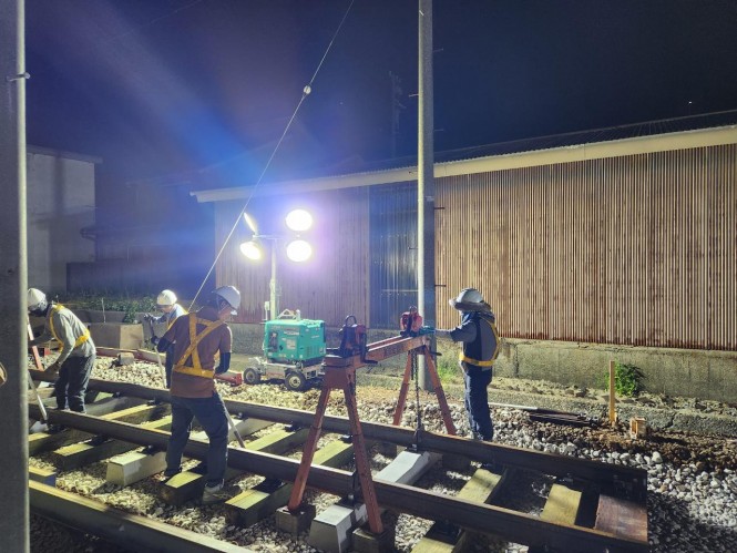 夜間作業は既存の軌条(レール)を新しいものに入れ換える作業であり、私たちが19:20頃に現場に着くと既に軌条が撤去されていて周りに多くの作業員の方々がおられました。