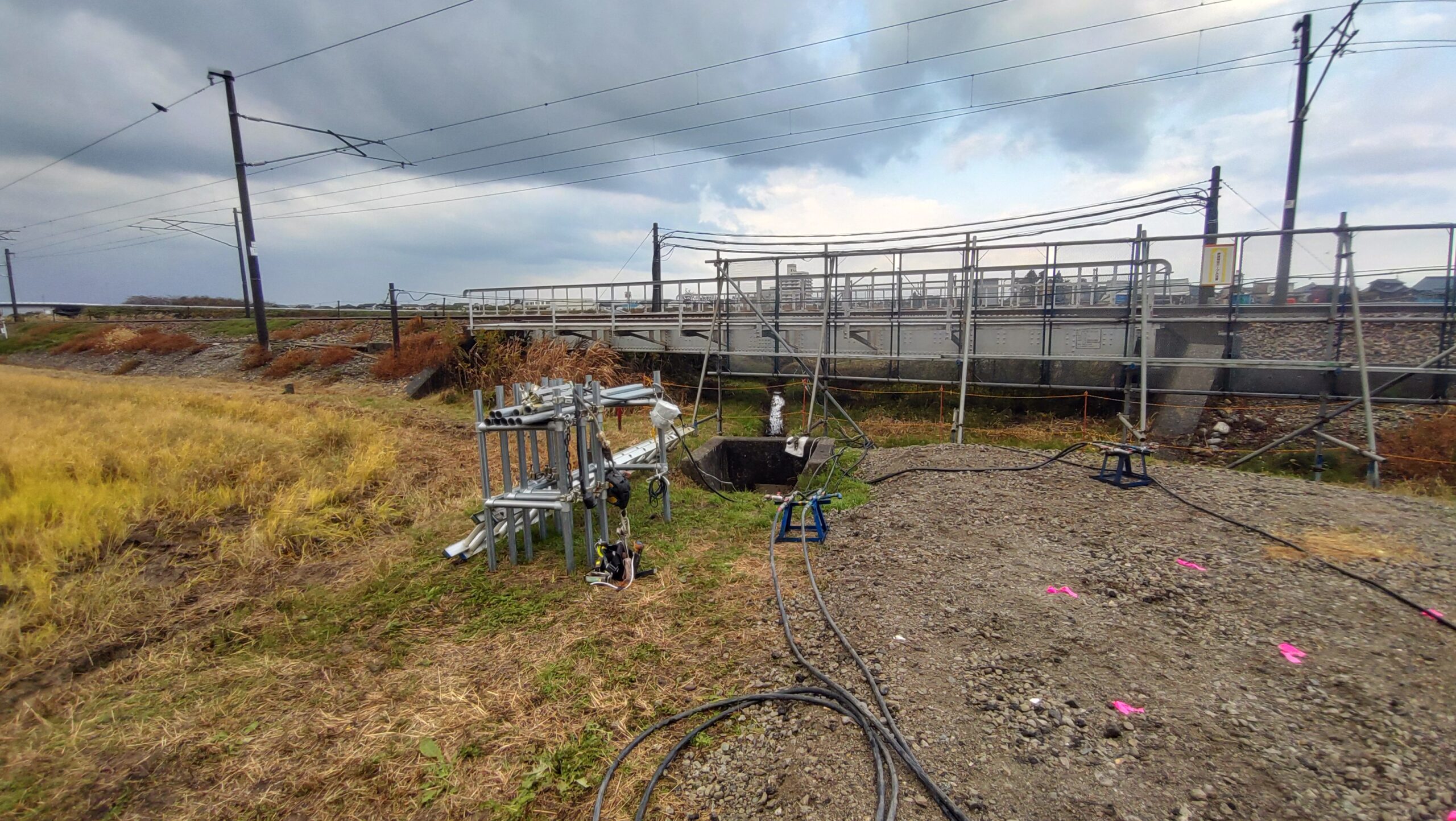 この線路をくぐるように下水管を布設する工事だそうです。