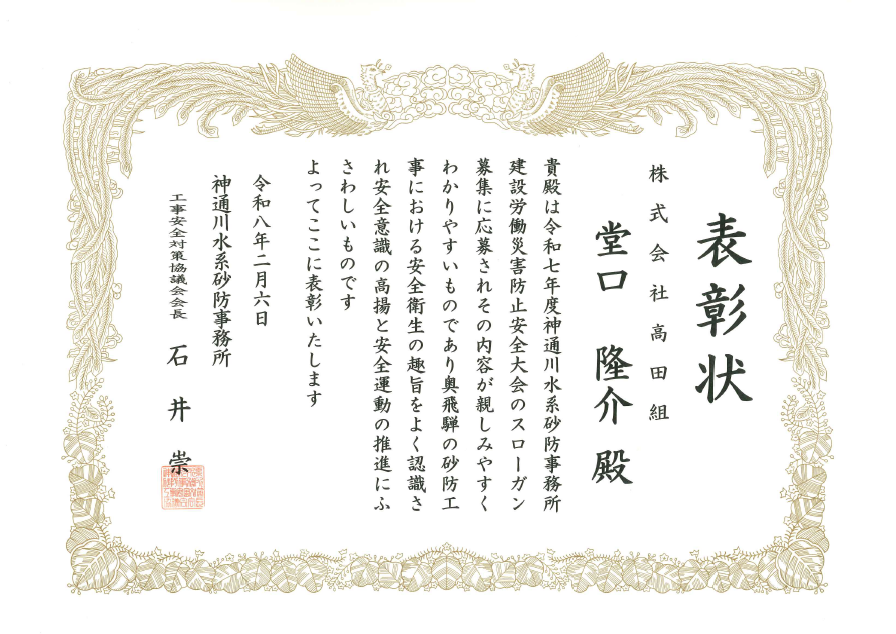 この度、令和7年度 神通川水系砂防事務所工事安全対策協議会にて堂口社長の安全スローガンが入賞いたしました!